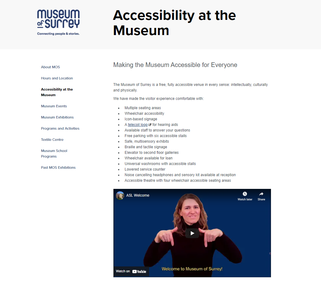 The Museum of Surrey has a dedicated page on their website that describes the various ways their venue welcomes diverse visitors. The on-page video is silent and makes use of both captions and a sign language interpreter.