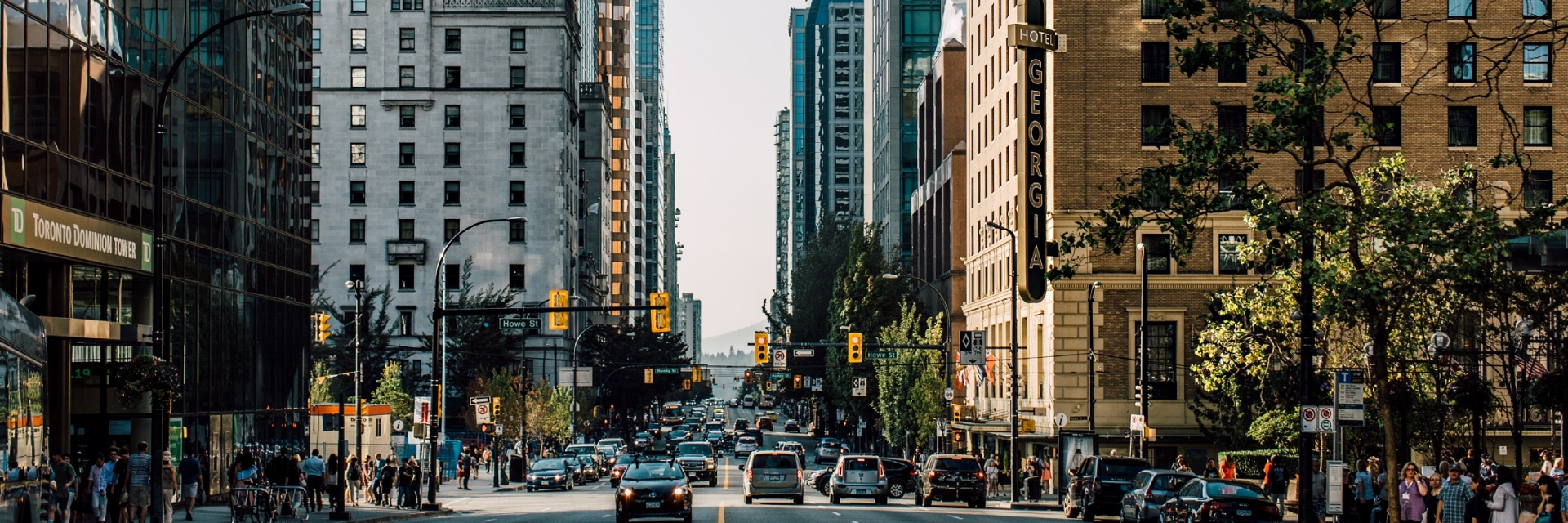 Georgia Street, Downtown Vancouver (can see the Rosewood Hotel Georgia, Fairmont Hotel Vancouver and Shangri-La Hotel)
