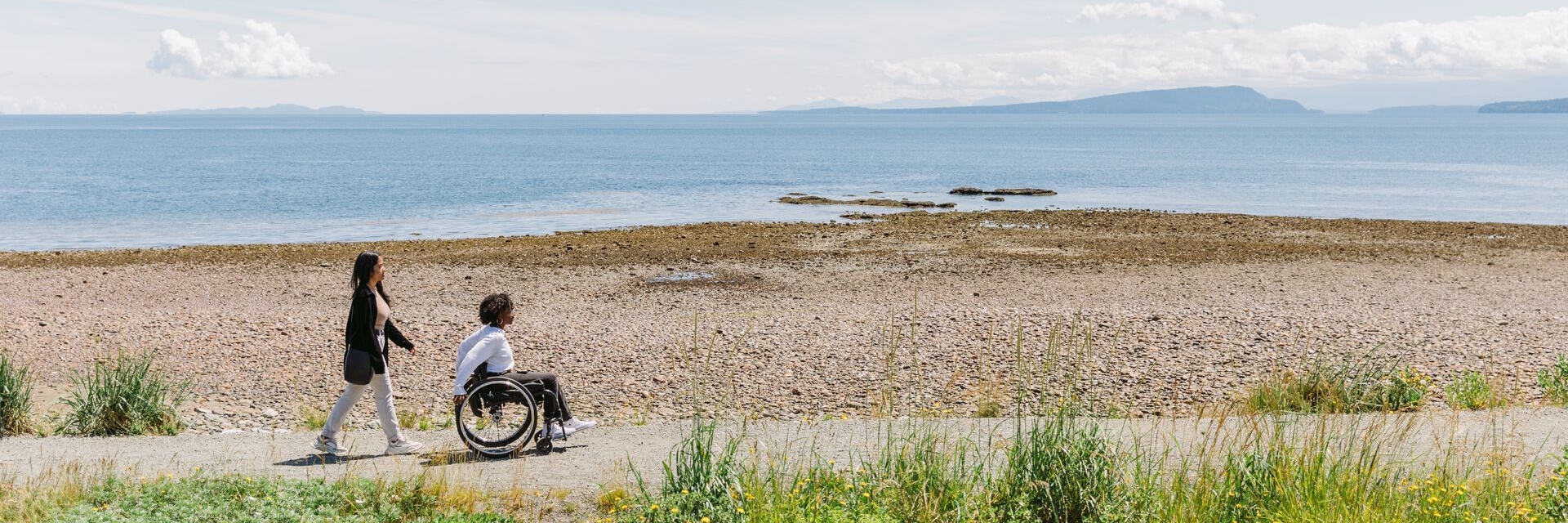 two people enjoying the seaside accessible trail at Point Holmes near Comox