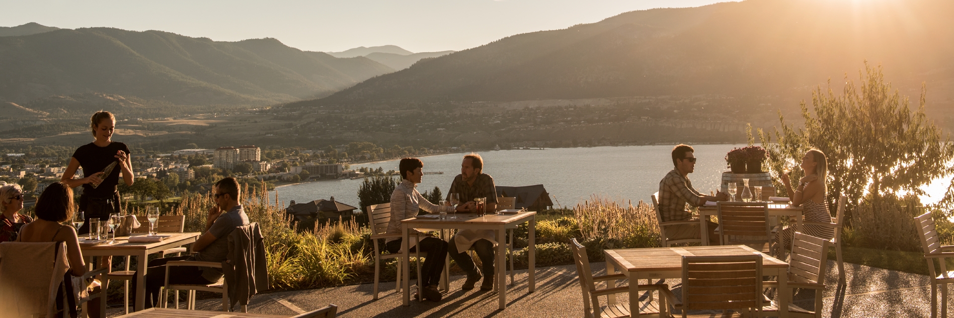 Patrons of The Vanilla Pod Restaurant at Poplar Grove winery enjoy dining on the patio with views of Okanagan Lake and Penticton, BC.