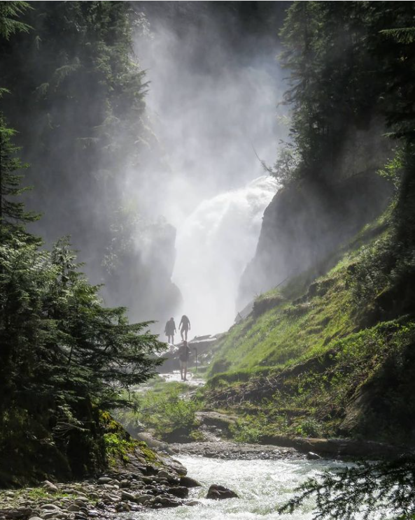 Mist from a waterfall in Glacier National Park creates ambiance, and the shadows from trees provide juxtaposition in this image by @adventures_with_chucky.