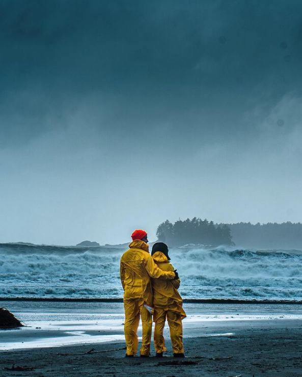 @zachramelan’s image employs a pop of yellow raincoats on a blue monochrome landscape in Tofino.