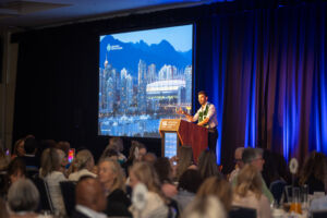 Image 1 | Left to Right: Krista Alcazar (Destination Vancouver), Lizzie Doyle (Destination BC Australia Media/PR), Claudio Fabiano (SBS, The Weekly Football Wrap), and Monica Leeck (Destination BC) pose together at IMM 2025 Australia; Image 2, 3 | Claudio Fabiano speaking at IMM 2025 Australia Luncheon sponsored by Destination BC.