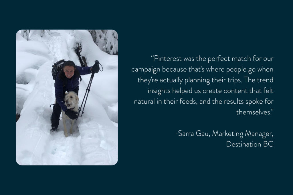 The campaign used Pinterest’s trending “Peak Travel” insights to feature BC’s snow-covered mountains at a time when Australian users were actively researching their ski vacations. With its visually rich format and engaged user base, Pinterest allowed Destination BC to reach people where they were already imagining their next winter holiday.