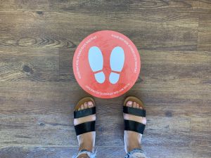 Physical distancing floor decals at Chilliwack Visitor Centre