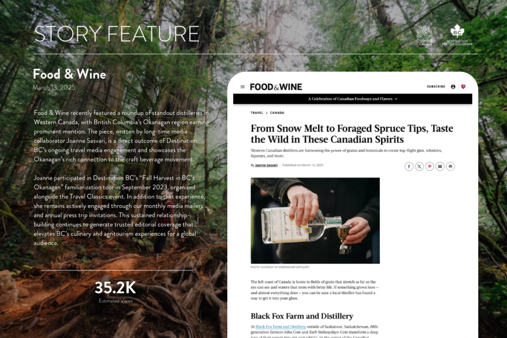 Food & Wine recently featured a roundup of standout distilleries in Western Canada, with British Columbia’s Okanagan region earning prominent mention. The piece, written by long-time media collaborator Joanne Sasvari, is a direct outcome of Destination BC’s ongoing travel media engagement and showcases the Okanagan’s rich connection to the craft beverage movement.