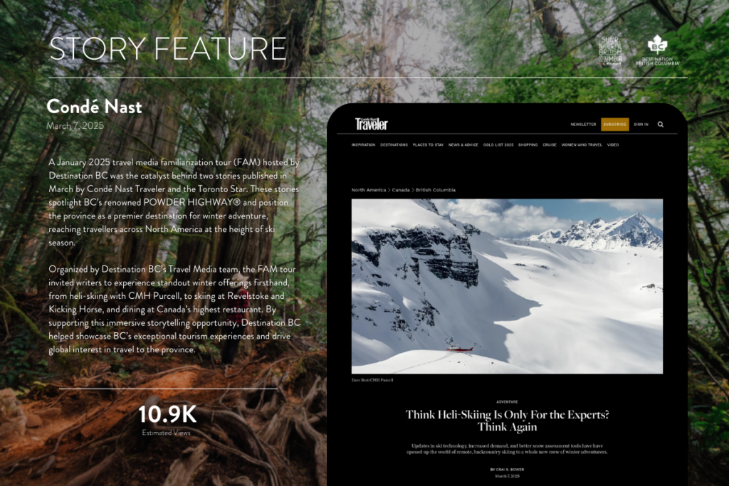 A January 2025 travel media familiarization tour (FAM) hosted by Destination BC was the catalyst behind two stories published in March by Condé Nast Traveler and the Toronto Star. These stories spotlight BC’s renowned POWDER HIGHWAY® and position the province as a premier destination for winter adventure, reaching travellers across North America at the height of ski season.
