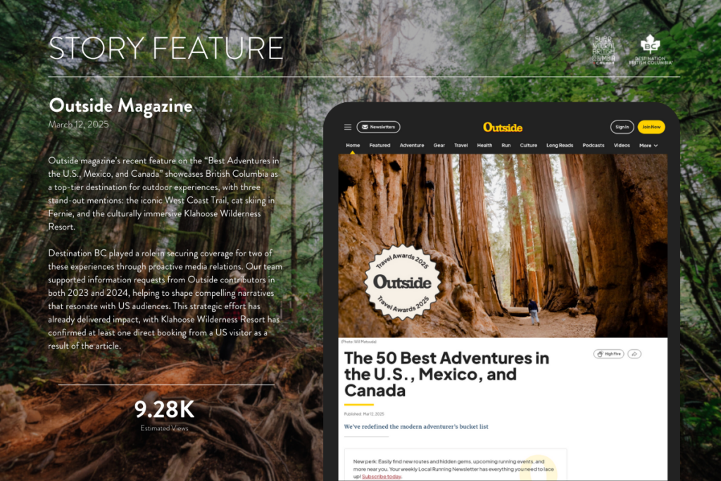 Destination BC played a role in securing coverage for two of these experiences through proactive media relations. Our team supported information requests from Outside contributors in both 2023 and 2024, helping to shape compelling narratives that resonate with US audiences. This strategic effort has already delivered impact, with Klahoose Wilderness Resort has confirmed at least one direct booking from a US visitor as a result of the article.