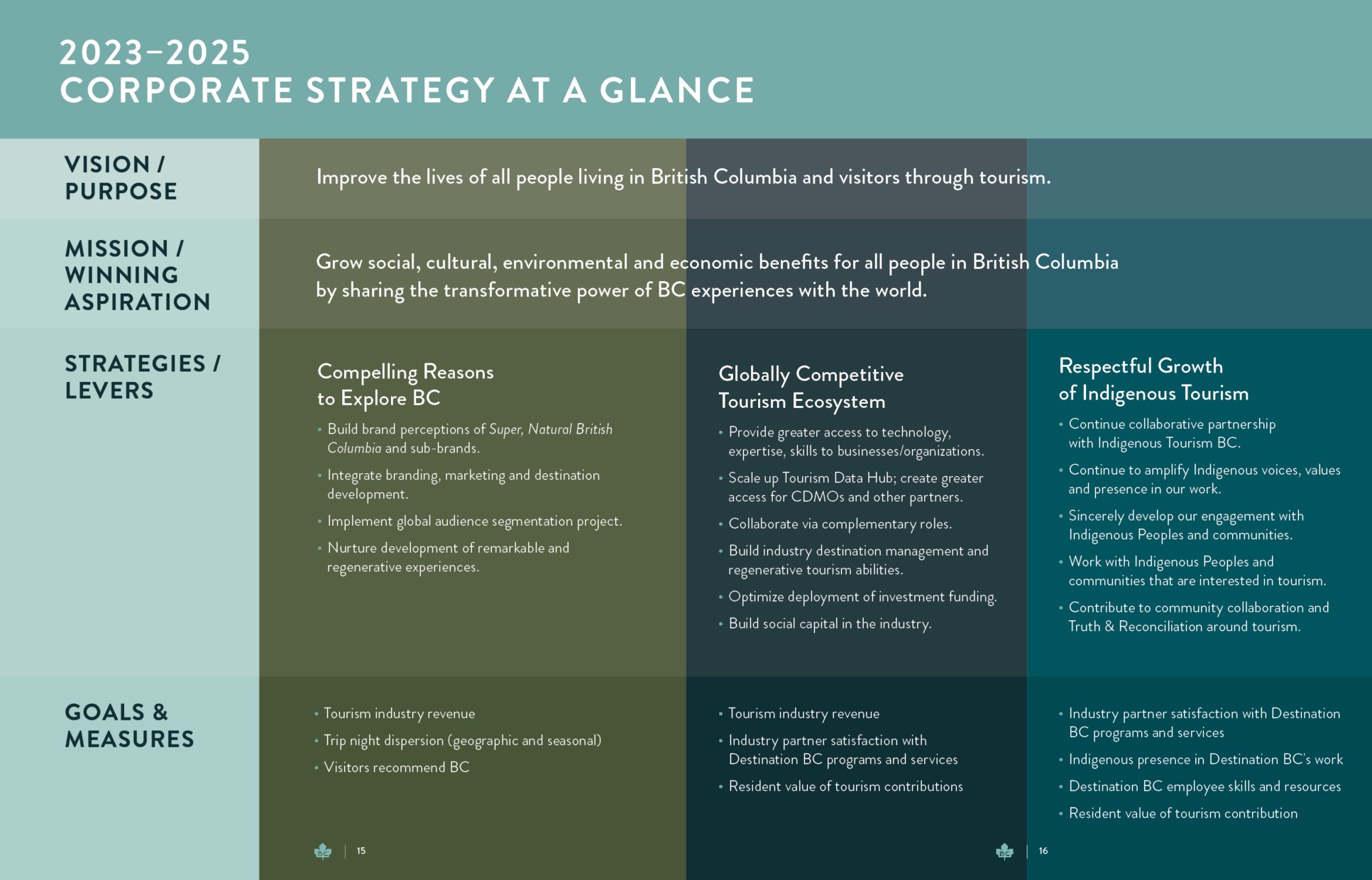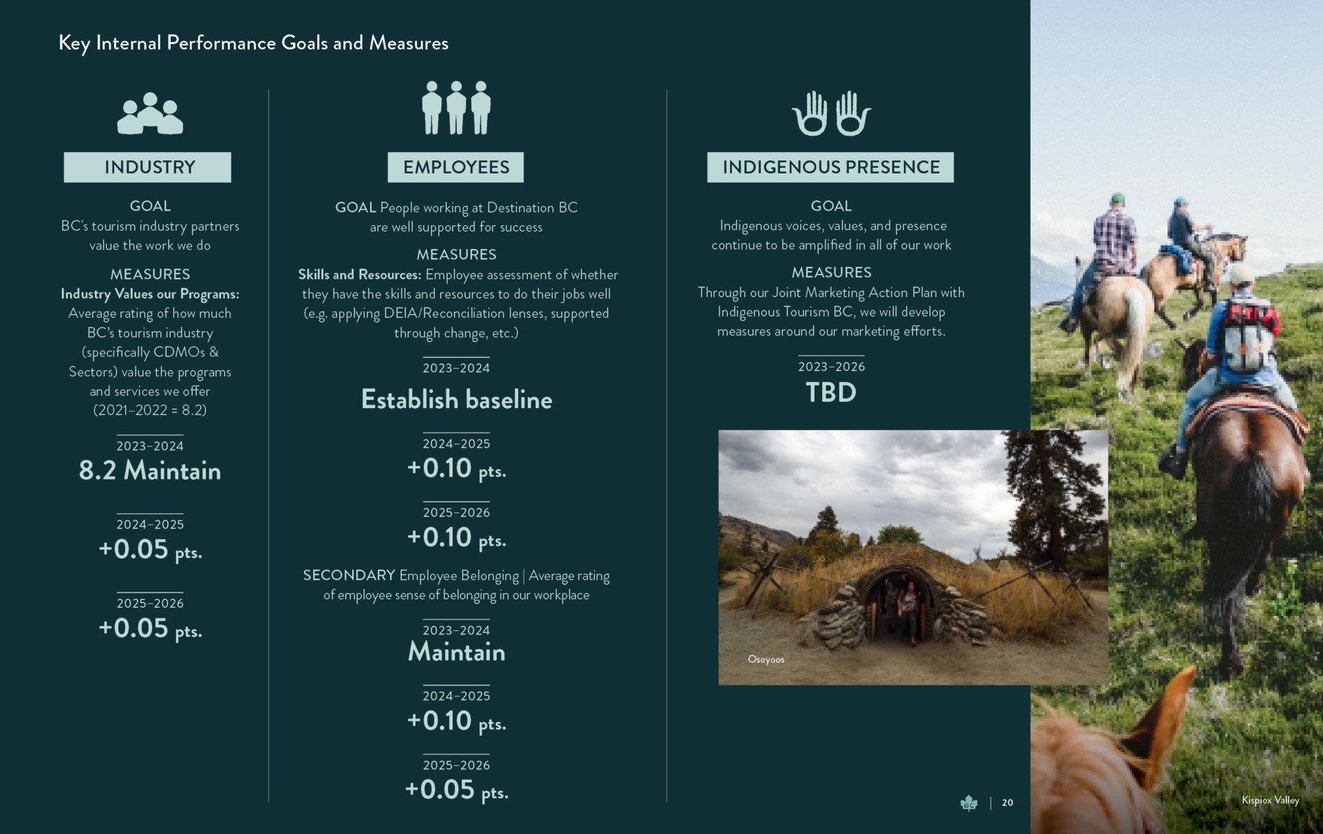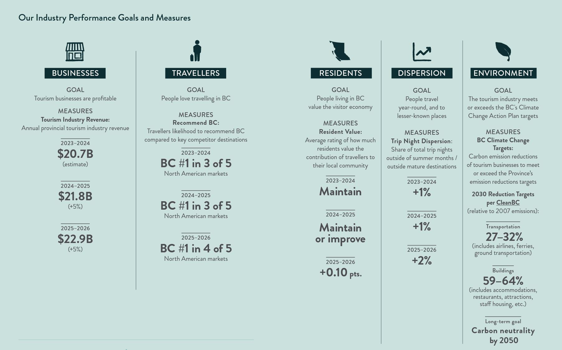 We will measure our work through eight important goals. Five are Industry Performance Goals and Measures that the entire tourism industry has a part in achieving. Three are Key Internal Performance Goals and Measures specific to Destination BC.