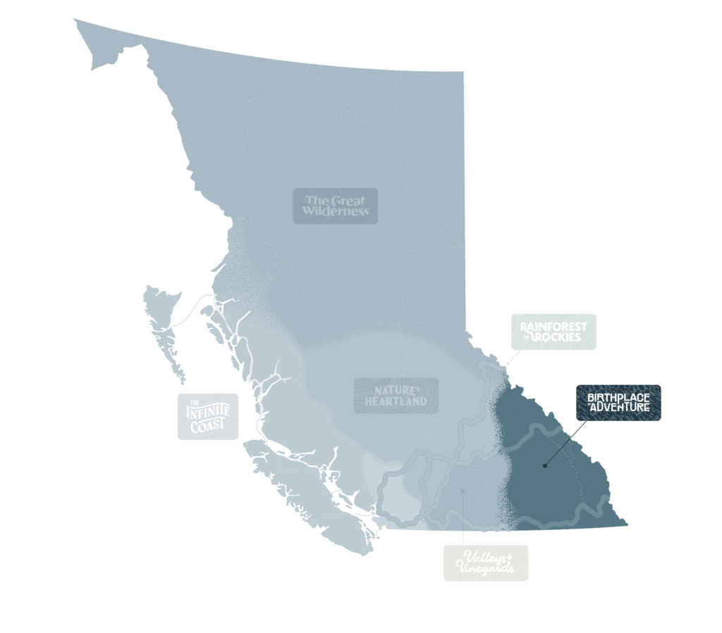 Birthplace of Adventure is set in the southeast corner of British Columbia, spanning from the Canadian Rockies across the Purcell, Selkirk, and Monashee ranges. The mountainous area includes four national parks, including the UNESCO-recognized Canadian Rocky Mountain Parks, more than sixty provincial parks, numerous hot springs, and many vibrant mountain towns, offering diverse outdoor experiences.