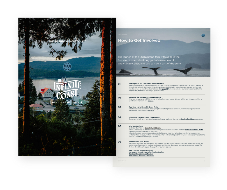 The best place for you to start is the industry toolkits—one for each destination brand. Inside these toolkits you’ll find practical tools, messaging frameworks, and creative assets that make it simple to weave the brands into what you’re already doing. While Destination BC will be focused on international markets, industry can use the assets and tools in their domestic marketing, too.