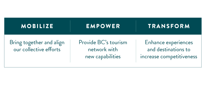 As an industry, we’re strongest together. To be successful, we need to engage our broader communities and grow together. That is why Destination BC’s Destination Management Plan concentrates on three pillars—mobilize, empower, and transform—as powerful building blocks to take our industry to the next level, together.